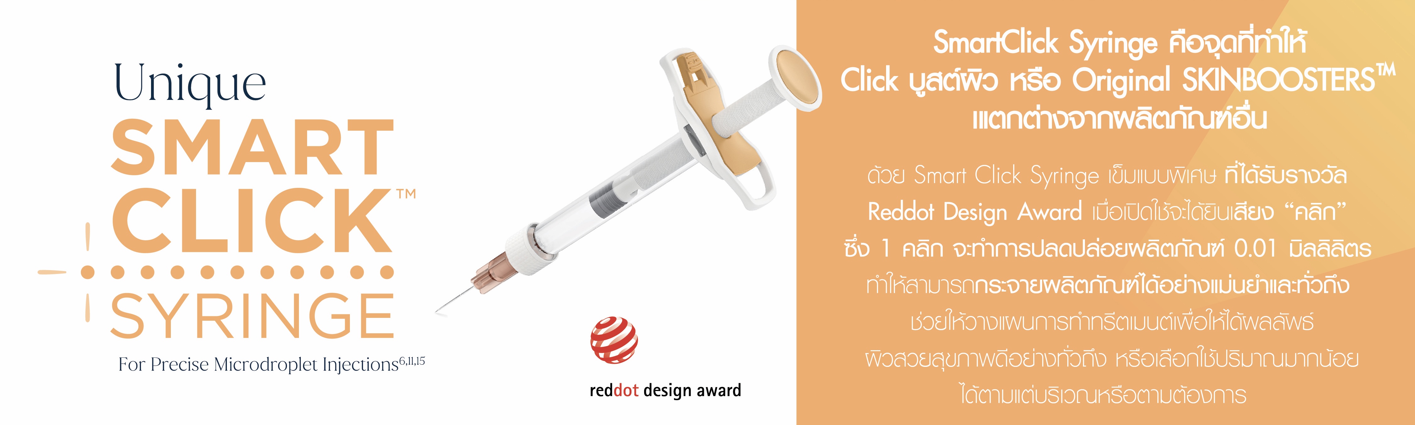 SmartClick Syringe เป็นเทคโนโลยีของกระบอกฉีดที่ออกแบบมาเพื่อควบคุมปริมาณตัวยาให้แม่นยำในทุกครั้งที่ฉีด โดยจะมีเสียง “คลิก” และทำการปลดปล่อยผลิตภัณฑ์ 0.01 มิลลิลิลิตร ช่วยให้สามารถกระจายตัวยาได้สม่ำเสมอ ลดความผิดพลาดในการฉีด และทำให้ผลลัพธ์เป็นที่น่าพอใจและปลอดภัยมากยิ่งขึ้น